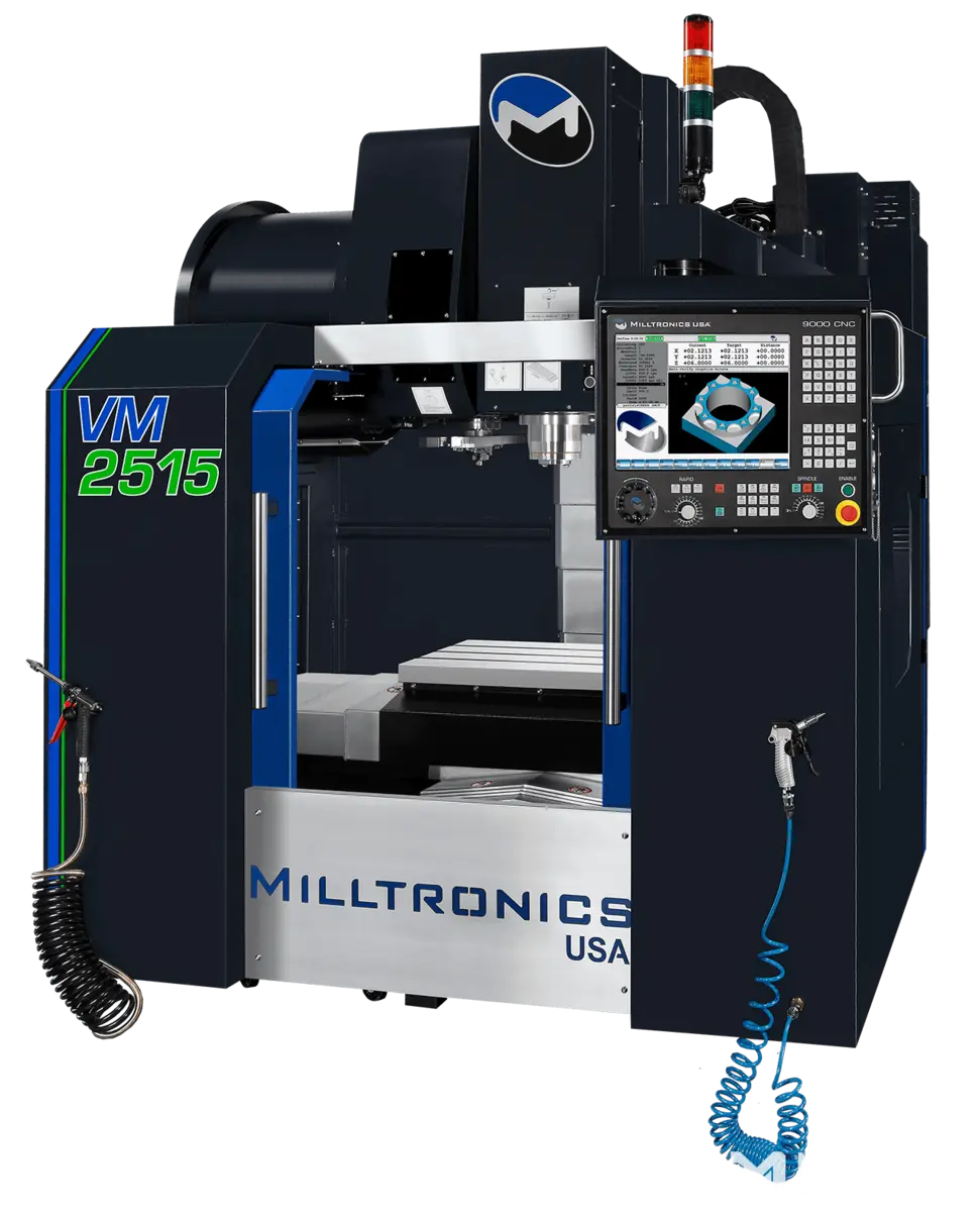 The Milltronics VM2515 has 25″ x 15″ x 20″ travels and a 30″ x 16″ table that supports 3,140 lbs table weight at full speed. The VM2515 has a 15 HP 10,000 RPM BIG-PLUS® spindle.