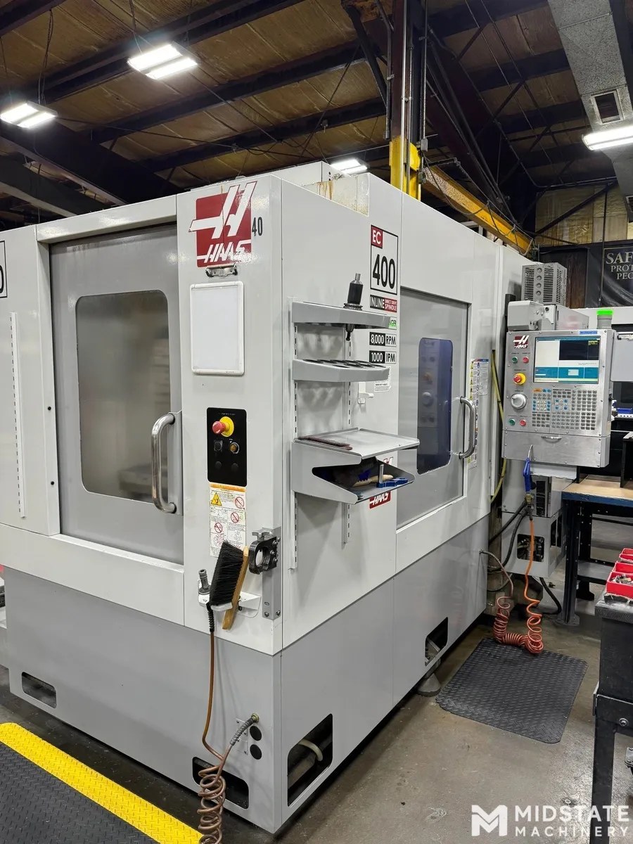 HAAS EC-400, 2008 CNC Horizontal Machining Center. Features include 20" X/Y/Z travel, 20 hp, 8,000 RPM spindle, CT40 taper, 24-tool ATC, and 15.75" pallets. Equipped with Haas CNC Control, 1 degree positioning, rapid 1,000 IPM, Chip Conveyor, Probe, Tombstones and more.