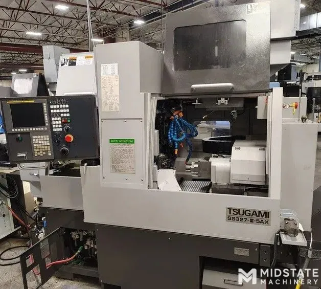 Enhancements to the Tsugami SS327-III-5AX include larger linear guides, increased ribs in the already solid base casting, a 4GB data server, Thermal Displacement Compensation sensors throughout, and 3 toggle clamping system, all standard on this robust platform.