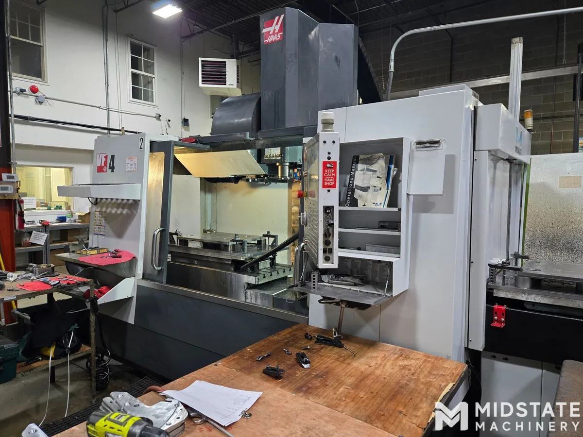 2012 Haas VF-4 CNC VMC in used condition. Features: 50"x20"x25" travel, 30 hp, 8,100 RPM, 24+1 ATC, CT 40 taper, 18"x52" table. Includes Auto Air Gun, Chip Auger, and more. Midaco Pallet Changer not included.