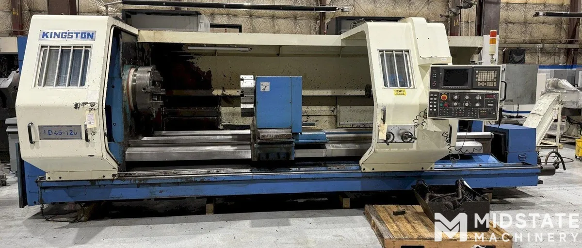 Kingston LD-45x120 CNC Flat Bed Lathe, New in 2006. Tailstock - Front and Rear Chucks - 25" 4 jaw Chuck - 32" 4 jaw Chuck - Chip Conveyor - Misc Turret System - Coolant System - Full Length Rear Chip Guard - 2 Pc Front Movable Chip Guard doors - Manuals