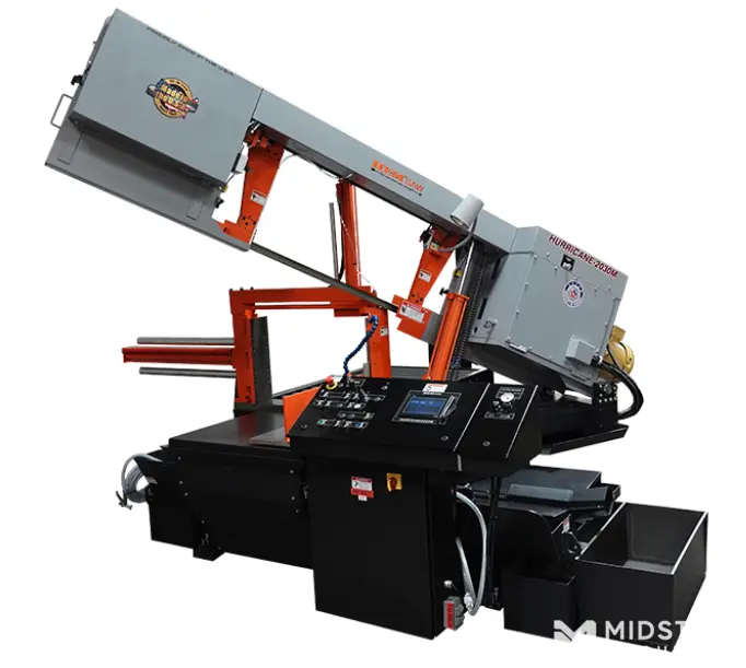 The Hurricane 2030M band saw miter cuts up to 60ᵒ in one direction. A touch screen control is mounted in a swing-away console for settings, operational functions, and diagnostics. The control allows manual or semi-automatic cutting. A chip auger is included and options like the Cut Watcher® are available.