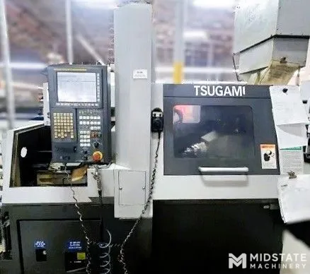 TSUGAMI SS20 Swiss Type CNC Lathe, New 2009. Fanuc i Series Control, 6-axis Machining, High-pressure Coolant, and Chip Conveyor. Equipped with 24 tool positions and live tooling. Spindle speed up to 10,000 RPM.