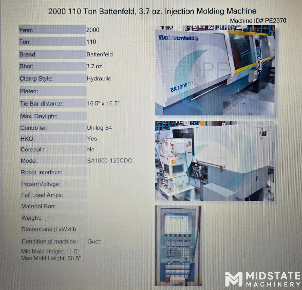 2000 Battenfeld details: Price: Operating hours: approx 28,000 Runs perfect, but needs software reloaded onto the IP161 control module. The module itself is somewhat new, it was replaced in 2019. It also was corrupted during a set of thunderstorms. I lowered the price to offset reinstall cost.